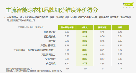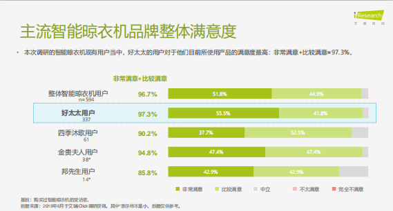 購(gòu)買(mǎi)智能晾衣機(jī)消費(fèi)者,對(duì)好太太智能晾衣機(jī)所使用產(chǎn)品的滿(mǎn)意度最高達(dá)到97.3%,且從晾衣機(jī)升降靈活度、遙控靈敏度、耐用度、滅菌消毒能力等多個(gè)維度上看,都是高于整體平均水平。