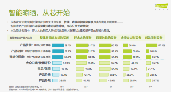 從本次受訪者選購(gòu)智能晾衣機(jī)的關(guān)注點(diǎn)來(lái)看,性能、功能和智能化程度是消費(fèi)者最為看重的,智能晾曬產(chǎn)品的核心訴求是其技術(shù)內(nèi)核的升級(jí),而非只是外觀優(yōu)化。