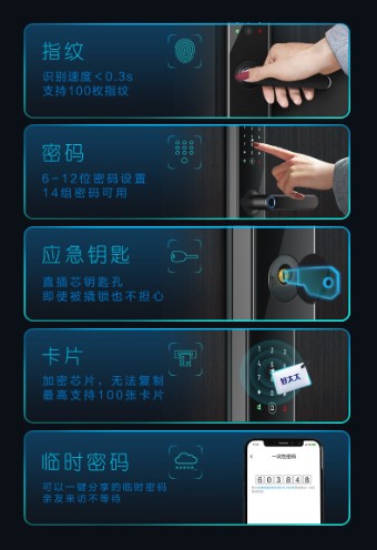 指紋、密碼、應(yīng)急鑰匙、卡片、臨時(shí)密碼